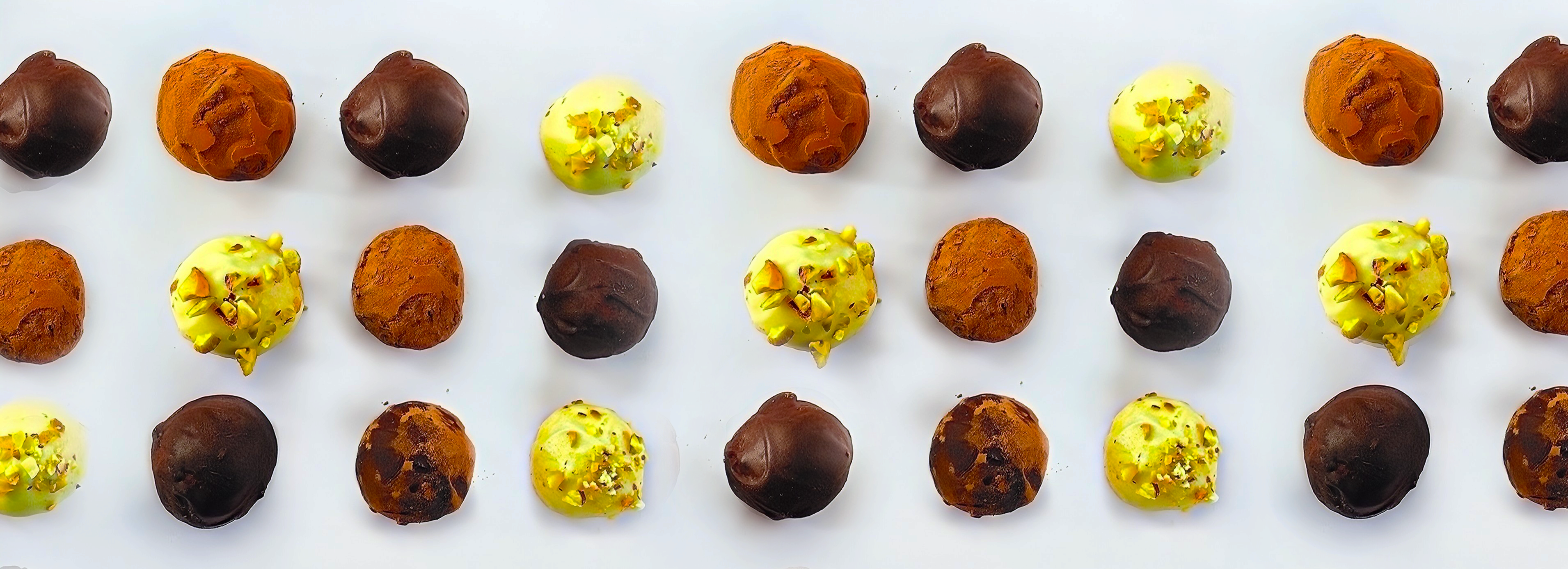 Cada trufa, ya sea de profundo chocolate negro o delicado chocolate blanco, está hecha a partir de los mejores granos de cacao, cuidadosamente seleccionados para garantizar una experiencia única en cada bocado. El ganache, batido hasta obtener una textura aterciopelada, se envuelve en una capa crujiente de chocolate, y cada pieza es finalmente terminada a mano con un toque de cacao o pistacho.